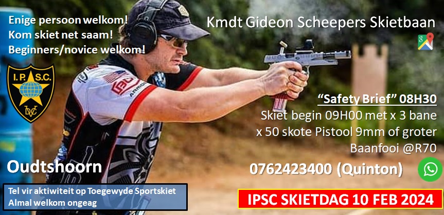 Join us on 10 Feb for an IPSC Handgun Club Shoot x50 rounds 9mm or larger Track fee @ R70 Safety Briefing @ 08h30 Click Here to Register